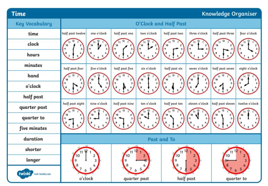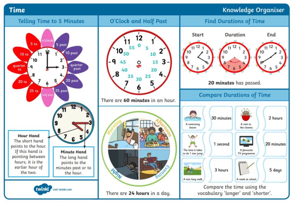Have a look at telling the time today. In year 2 we look closely at telling the time in 5 minute intervals. I have left the link to a great powerpoint presentation to help both you and your children out as well as out year 2 time knowledge organiser.