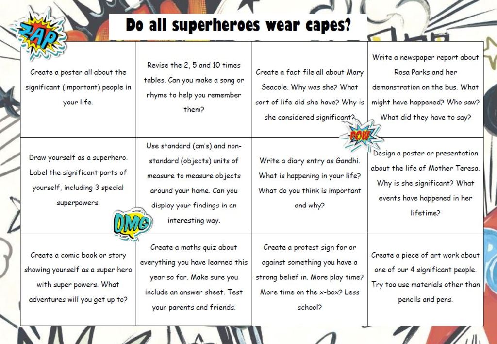 For those children self isolating over the next couple of weeks here is a HMWK grid to complete. You will find lots of activities that would have been completed in the classroom. If you need any resources or help with any of the following please do not hesitate to contact school.